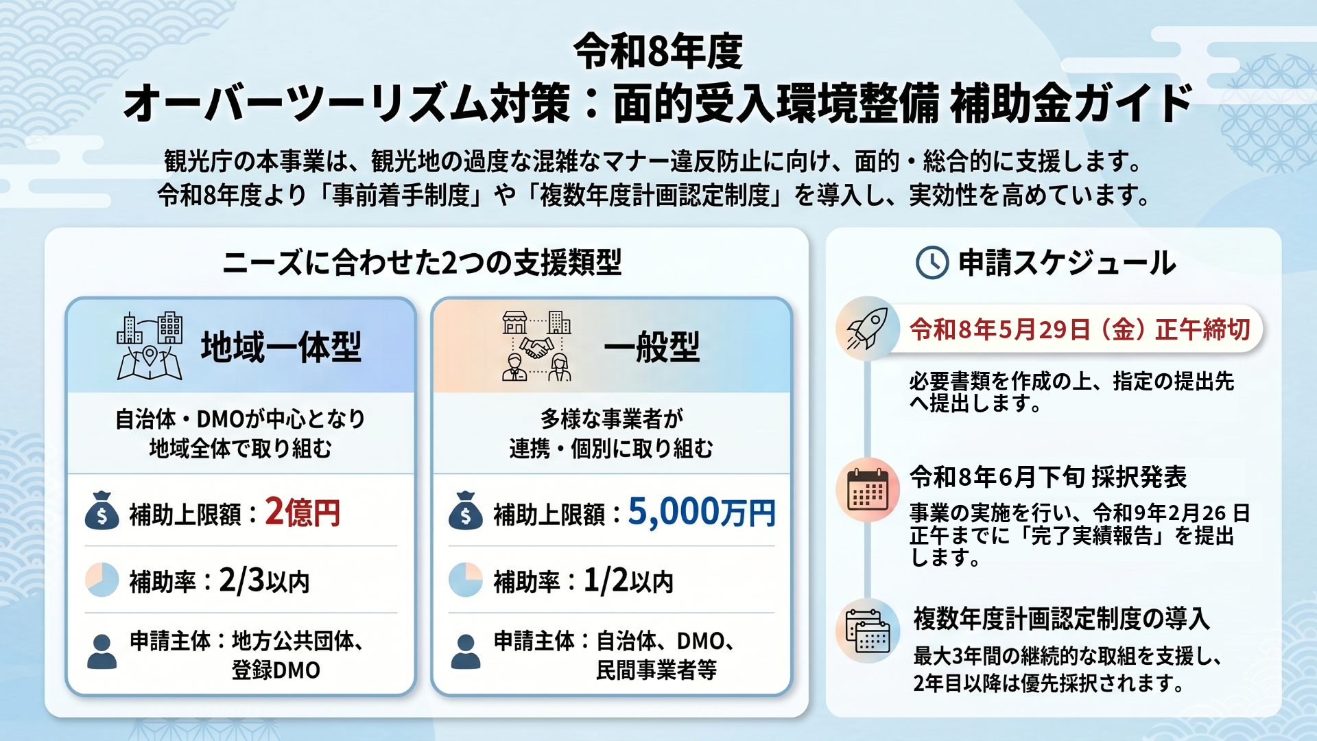 引用元:観光庁「令和8年度オーバーツーリズムの未然防止・抑制をはじめとする観光地の面的受入環境整備促進事業」公募要領